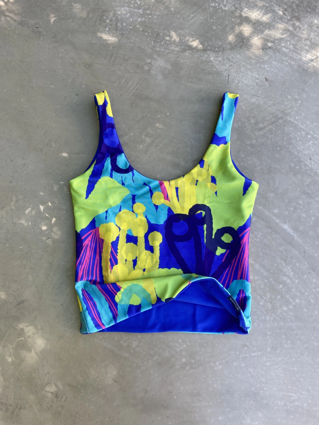 Musculosa reversible con escote y espalda abierta, de lycra, estampada de un lado, lisa del otro en color Azul Francia.